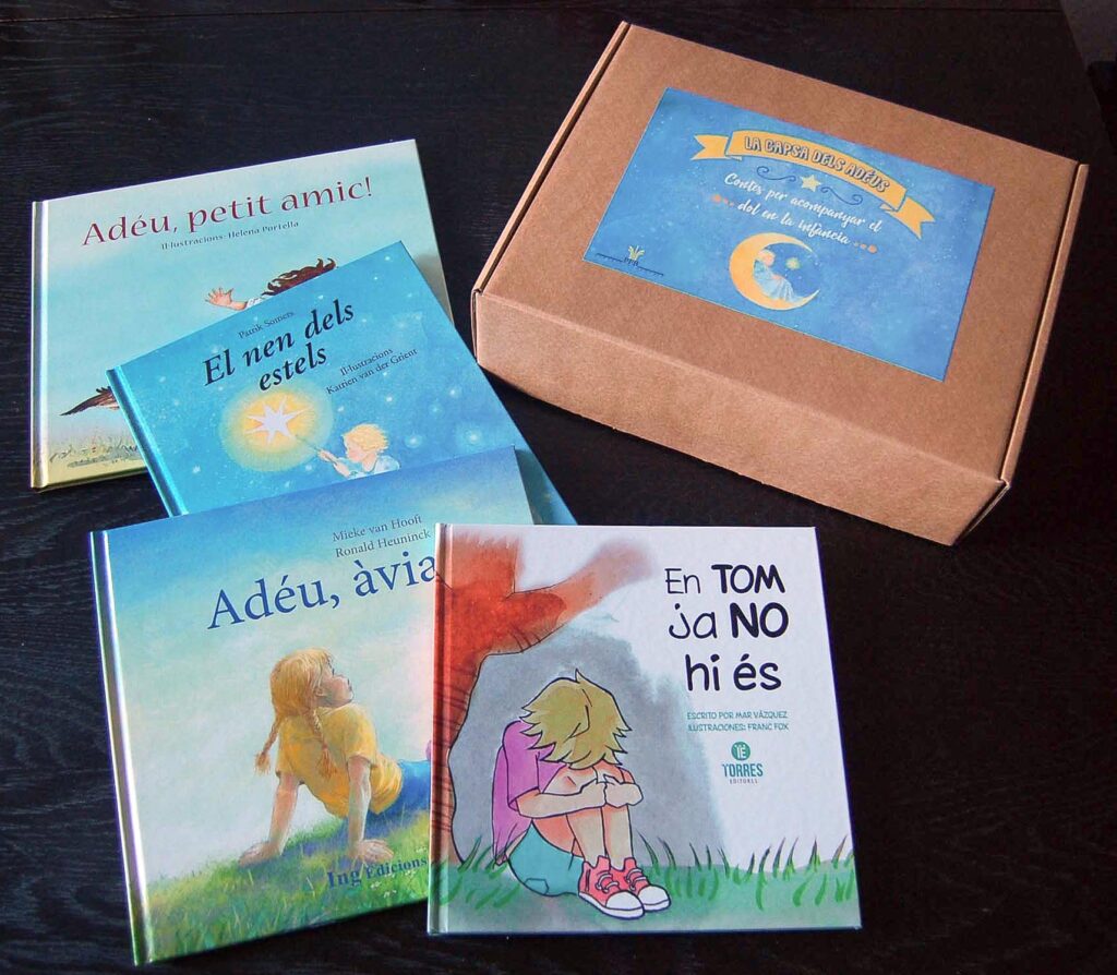 La Capsa dels adeus és un recurs d’ajuda al dol que conté quatre contes -cadascun en versió català i castellà- que tracten sobre diverses situacions de dol, com ara la pèrdua d’un germà, d’una mascota, d’una àvia i d’un amic. La iniciativa, creada per PFB, va sorgir com a eina d’ajuda per a infants entre 3 i 9 anys per a comprendre, des d’una mirada propera i empàtica, el procés de pèrdua i dol. Llançada el 2018, es va distribuir com a recurs gratuït per a les escoles d’educació infantil i primària dels diversos municipis del Barcelonès, Maresme i Baix Llobregat on PFB presta servei. El projecte va arribar poc després a les biblioteques municipals d’aquestes poblacions i, actualment, es pot sol·licitar des del web de PFB.