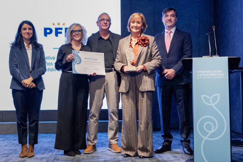 Badalona (Barcelona). El projecte Capsa dels adeus de PFB Serveis Funeraris ha estat reconegut en la categoria de “Millor iniciativa d’atenció i acompanyament emocional a les persones abans, durant i després del dol” en el marc de la segona edició dels Premis Albia de Sostenibilitat 2025, organitzats per Grup Albia. La cerimònia de lliurament dels guardons -que van reconèixer un total de cinc propostes d’àmbit estatal en matèria de medi ambient, responsabilitat social i bon govern, amb aplicació o potencial al sector funerari-, va tenir lloc el passat dijous 20 de novembre a Madrid i va comptar amb la presència d’Ana Gassió, directora general de PFB Serveis Funeraris, Carlos Albalate, director de l’àrea de Serveis de la companyia, i Carolina Mariscal, en representació del departament d’Atenció a les Famílies de l’empresa.